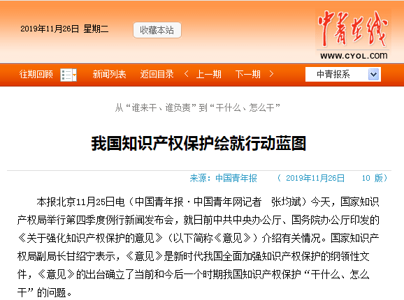 本报北京11月25日电(中国青年报·中国青年网记者 张均斌)今天,国家知识产权局举行第四季度例行新闻发布会,就日前中共中央办公厅、国务院办公厅印发的《关于强化知识产权保护的意见》(以下简称《意见》)介绍有关情况。国家知识产权局副局长甘绍宁表示,《意见》是新时代我国全面加强知识产权保护的纲领性文件,《意见》的出台确立了当前和今后一个时期我国知识产权保护“干什么、怎么干”的问题。